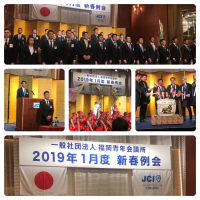 2019年度最初の例会である、新春例会を開催させて頂きました。来賓には福岡県知事 小川洋様、福岡市副市長 貞刈厚仁様、福岡商工会議所会頭 藤永憲一様、福岡JCシニアクラブ会長 河邉哲司先輩をお招きし、