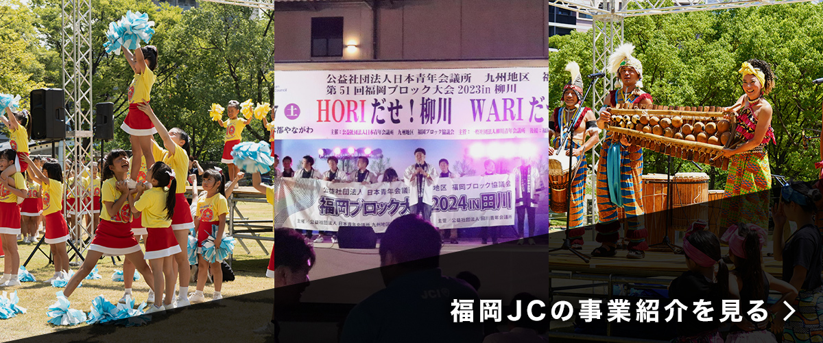 一般社団法人福岡青年会議所(福岡JC)とは、“明るい豊かな社会”の実現を目指し、様々な活動を行なう団体です。次代の在るべき姿を見据え、市民・企業・行政・諸団体と連携しながら主体性を持って活動を行なっています。